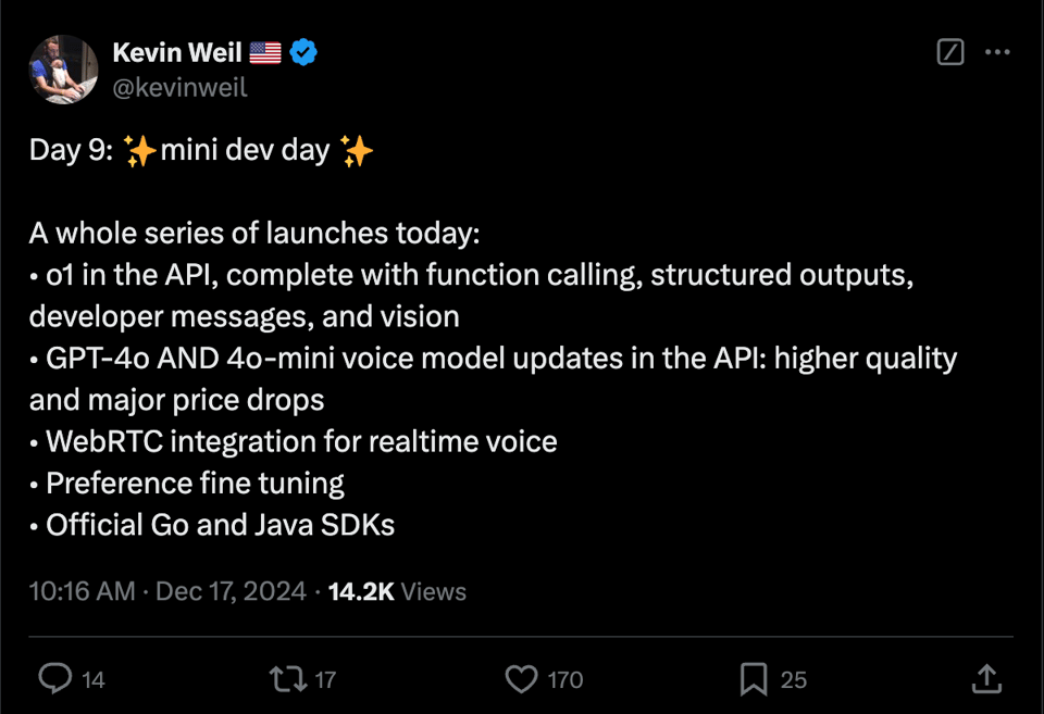 [AINews] o1 API, 4o/4o-mini in Realtime API + WebRTC, DPO Finetuning • ButtondownTwitterTwitter